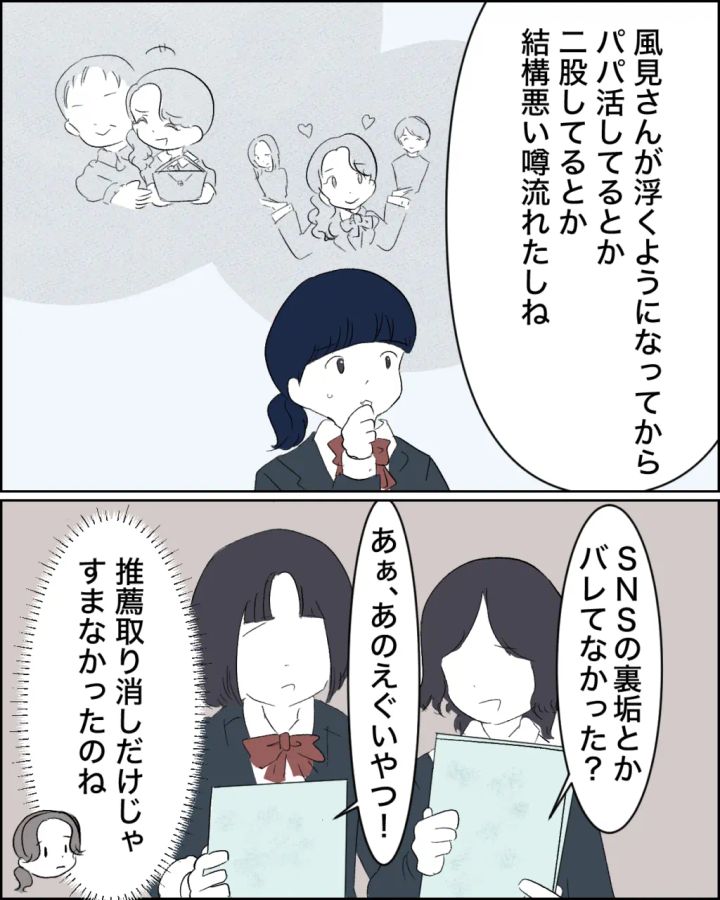 「風見さんが浮くようになってからパパ活してるとか二股してるとか、結構悪い噂流れたしね」とカナちゃんが言うと、「SNSの裏垢とかバレてなかった?」「あぁ、あのえぐいやつ!」とお友達が話していました。子ども達の話しを聞いて、風見さんは推薦の取り消しだけでは済まず、友達も失い、学校での居場所もなくしたことがわかりました。これまで自分がやってきたことの報いを受け、風見さんはどう感じでいるのでしょうか。