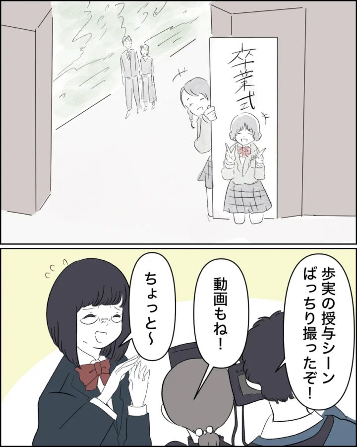式が終わると、卒業生たちがあちこちで記念撮影をしています。私と博之は歩実の姿を見つけて「歩実の授与シーンばっちり撮ったぞ!」「動画もね!」と駆け寄ると、「ちょっと~」と恥ずかしそうに笑う歩実。