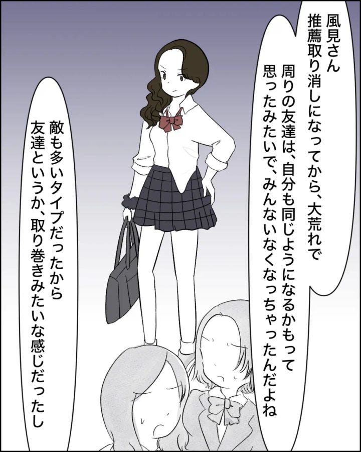 お友達の話しによると、風見さんは大学の指定校推薦を取り消されてから大荒れで、周りの友達も自分も同じようになるかもしれないと思ったようでみんな風見さんから離れていったそう。そもそも、敵も多いタイプだったため、周りにいた子も友達というよりは取り巻きのような感じだったといいます。