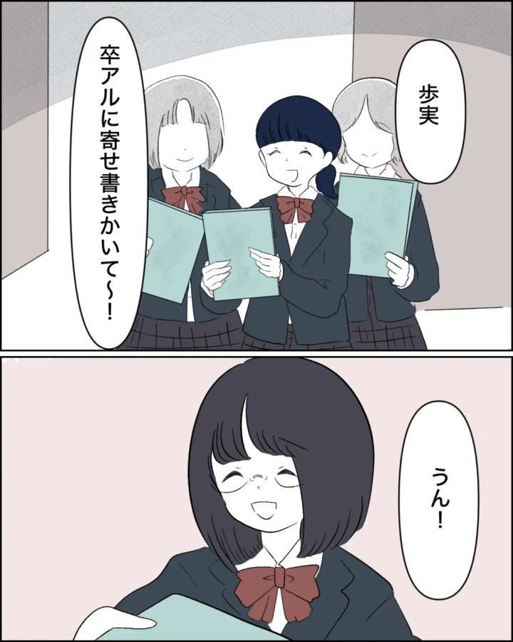 すると、「歩実、卒アルに寄せ書き書いて~!」とカナちゃん達がやってきて「うん!」と嬉しそうにアルバムを受け取る歩実。