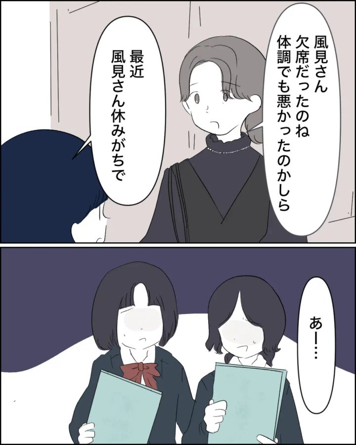 楽しそうに寄せ書きをする子ども達に「風見さん、欠席だったのね。体調でも悪かったのかしら」と話しかけると、カナちゃんが「最近風見さん休みがちで」と教えてくれ、他の女の子たちも「あー・・」と微妙な表情を浮かべ顔を見合わせます。