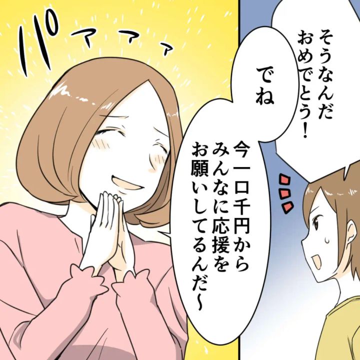 するとようやくハルちゃんママは本題に入りました。一口千円から、みんなに応援をお願いしているそうです。おめでとうとは言いましたが、内心では中学生の全国大会出場に、近所に寄付を募るの?しかもわざわざ訪問してまで?と驚いていました。