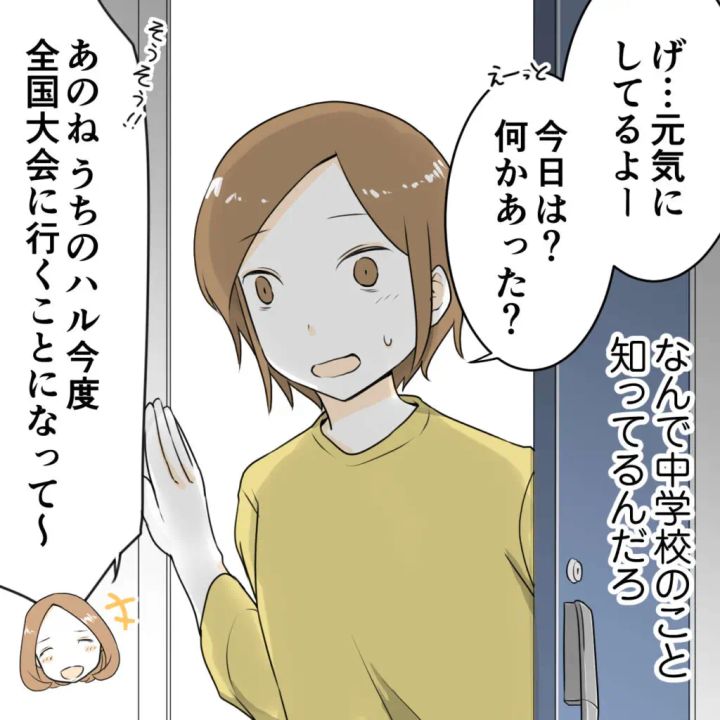 娘の中学校情報をどこから?でもまぁ近所だから通学中に制服姿を見かけたことでもあるのかな、と思いつつ、「何かあった?」と聞くと、ハルちゃんが全国大会に行くことになったと言います。そのお知らせを近所に言って回っている?こんな夜になってから?なんとなく不信感をぬぐえない私。
