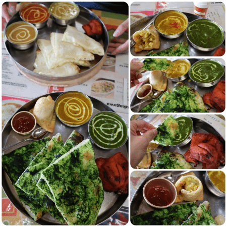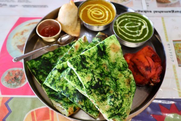 色鮮やかなグリーンが目を引くほうれん草のナン、 そしてトレイに並べられたカレー(シーフード・ほうれん草)やチキンティッカと、 かぐわしいスパイスの香りが漂い食欲をそそります。