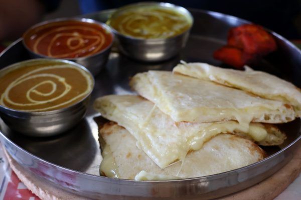 こちらは、3種のカレー(豆・キーマ・チキン)と共に とろけるチーズがたっぷりと挟んであるチーズナン。 カレーと合わせて食べると至福のひと時。
