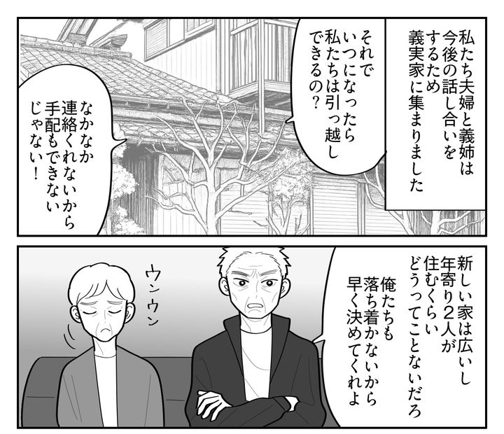 私はアサミ。夫ショウと、小5の息子ヒロとの3人家族です。ずっと賃貸アパート暮らしでしたが、このたび念願の新居を建てました。新しい家はショウの事務所兼用の建物で、入口が2つあります。しかし義両親は「自分たちと同居するために建てた二世帯住宅」だと思い込んでいました。その勘違いから自宅を売却する手配まで進めていて、近いうちに出て行かなければならないようです。私たち夫婦は困惑し、義姉と3人で頭を抱えてしまったのでした。