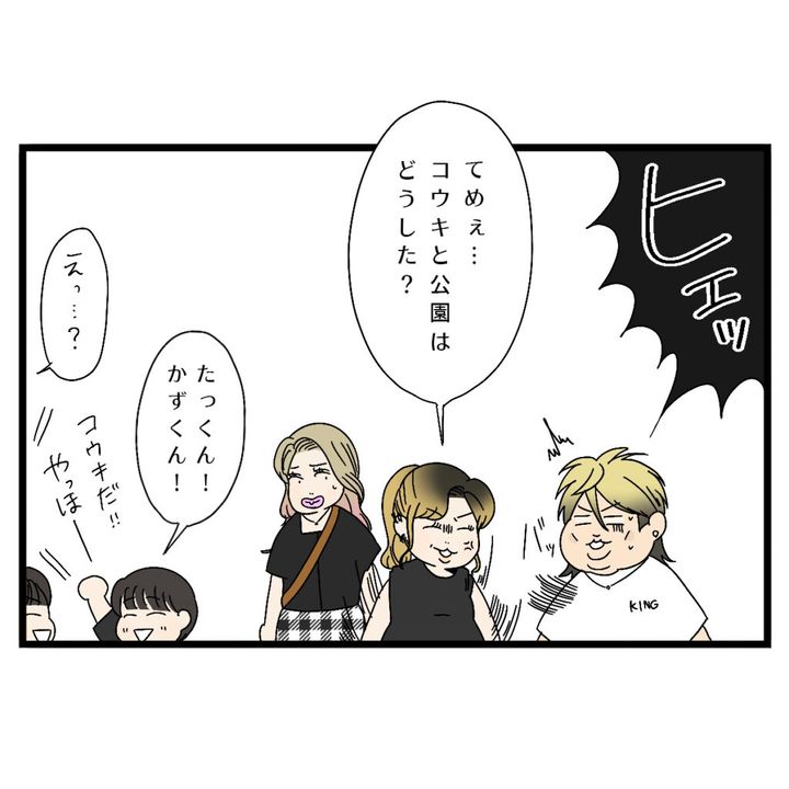 愛想笑いでその場をしのごうとするママさんたちに「たまには息抜きとか必要ですよ」と母親の大変さを理解している振りをして強引に誘おうとしたその瞬間、信也さんの耳に「おい」とひと言、聞きなれた声が背後から聞こえました。カナさんから連絡を受け、コウキくんを連れてやって来たサチさんです。