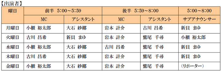 毎週 月曜~金曜 朝5時00分~8時00分(関西ローカル)