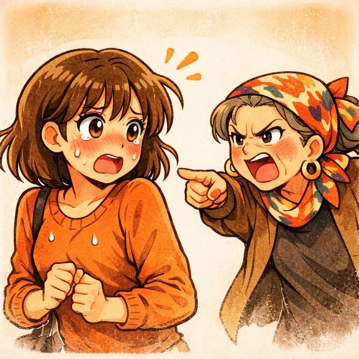 振り返ると、派手なスカーフを巻いた年配の女性が、鬼の形相で私を睨みつけていました。