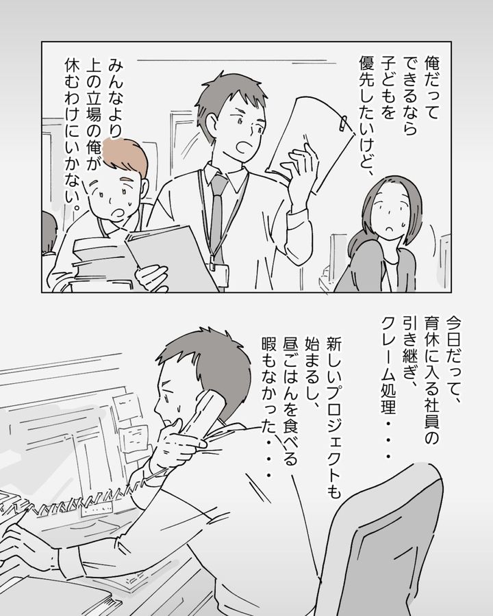 俺だって、できるなら子どもを優先したいです。ですがみんなより上の立場である以上、急に休むわけにはいきません。今日だって育休に入る社員の引き継ぎやクレーム処理、新しいプロジェクトも始まるし、昼休憩を取る時間すらありませんでした。