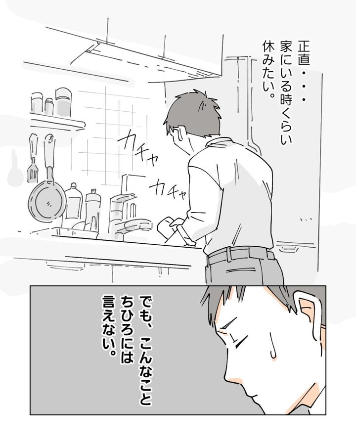 職場があんな状況だからこそ、せめて家にいる時くらいはゆっくり休みたいと思ってしまいます。でも、ちひろにはこんなこと口が裂けても言えません。俺は休みたい気持ちを必死に押し殺しながら、黙ってシンクに溜まった食器を片付けました。