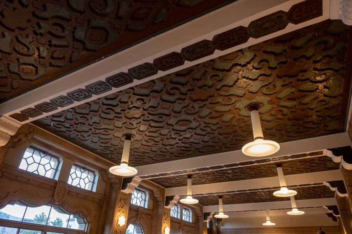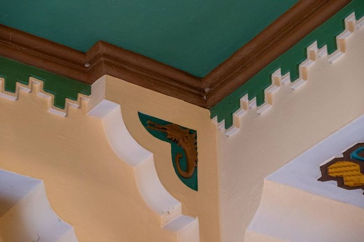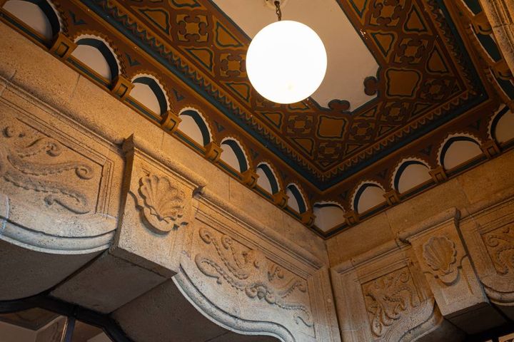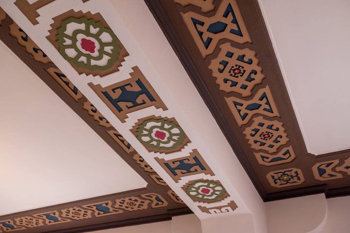 フロアごとに異なる天井デザインも要チェック。イスラム風のアラベスク模様の天井や、細かい細工が施された天井など、どのフロアもとても凝ったデザインです。細かな修理やメンテナンスを繰り返し、当時の意匠を維持しているそう。