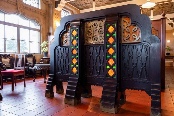 内装はもちろん、調度品の意匠は部屋ごとに違うのも注目ポイント。こちらの照明付きのパーテーションはヴォーリズデザイン。重厚感があって、丸みを帯びたシルエットもかわいいですね。