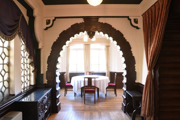 建築当時の雰囲気が最も色濃く残る2階は、かわいいアーチが印象的です。重厚感あるアーチには豪華な彫刻が施され、思わず見入ってしまいます。ちなみにこちらは10~18名まで利用できる個室。このほかに、2名から利用できる各種個室があり、コース料理をいただくと利用することができます(前日までの予約)。