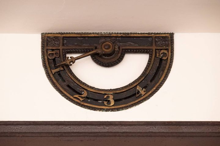 回数を表示する半円形のフロアインジケーターもレトロでかわいい! アナログな時計針式で、エレベーターの動きにちゃんと連動して針が動きます。こうしてみると1階と4階フロアの天井が高いことがうかがえます。