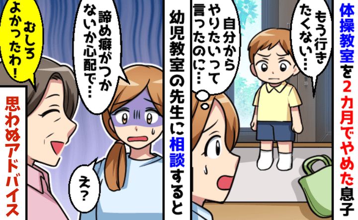 息子が3歳のとき、体操教室に通うことにしました。しかし、たった2カ月でやめることに。短期間しか続けられなかったことを母親として悩んでいた私が、幼児教室の先生に相談すると、意外な言葉が返ってきて……?