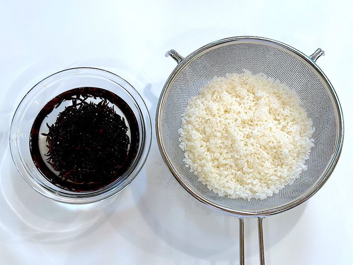 1. ひじきは水で戻し、米は洗ってザルにあげておく。