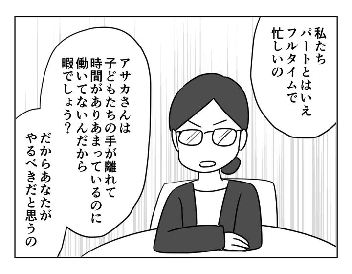 今回の主人公は40代半ばの専業主婦、アサカさん。アサカさんの夫は三人きょうだいの三男で、長男一家と次男一家、義実家はすべて車で20分ほどの距離に住んでいます。アサカさんのお子さんたちは少し前に成人して手が離れたのですが、今度はお義母さんに助けが必要になるように。そんなとき、突然長男嫁リツコさんに「あなたが世話をしろ」と言われてしまいました。しかも理由は専業主婦で暇だろうから。到底納得できるものではありません。