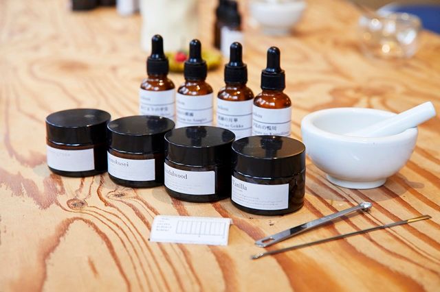 木のテーブルの上には粉末の香料やアロマオイルなど、体験に必要な材料がそろえられています。スタッフの方が丁寧に手順を教えてくれるので、初めてでも安心して体験することができます。
