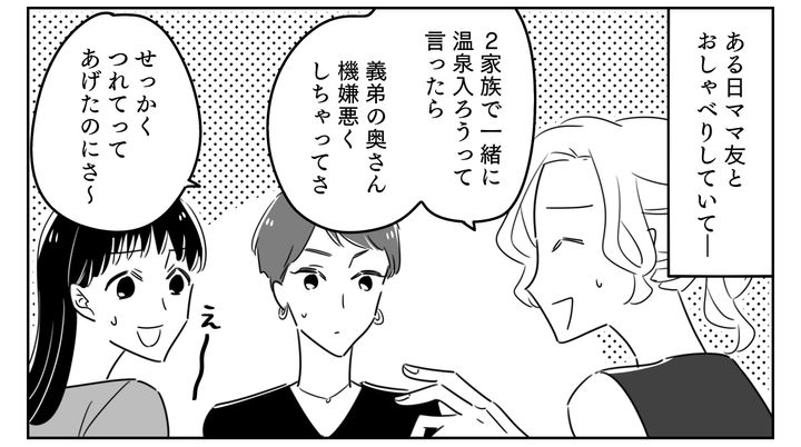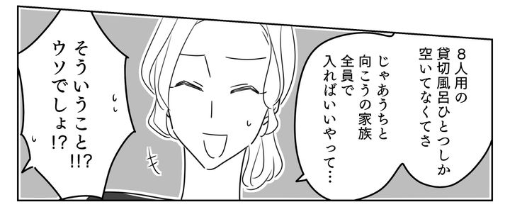 私はユリ(35)。先日、旦那のアサヒ(37)と義弟・コウダイ(32)と、義妹・アンジュ(31)ちゃんと子どもたちが、新しく建てたわが家に泊まりに来てくれました。和やかで楽しいBBQを終えたのですが、貸し切り風呂を提案したあたりから、なんだか雰囲気がおかしくなってしまって……。私のお気に入りの場所なので、絶対に義弟家族を連れて行きたかったのです。でも貸し切り風呂が空いておらず、唯一空いていた8名用のお風呂に、みんなで入ろうと提案しました。