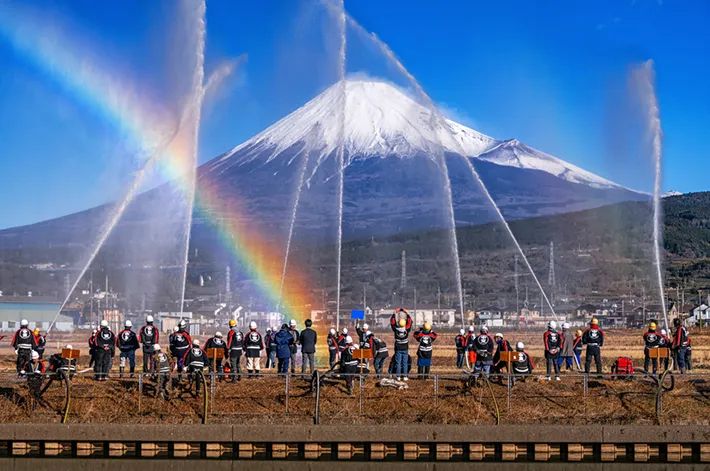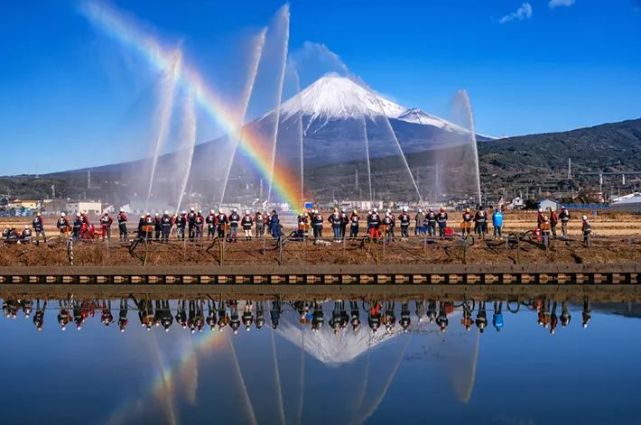 富士山のもとで『一斉放水』 新年にふさわしい写真に「なんて縁起がよい光景」