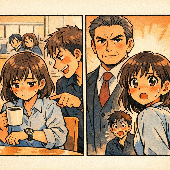 上司は険しい表情で同僚を見据えています。先ほどまで勝ち誇っていた同僚は、一瞬で顔を真っ青にして言葉を詰まらせました。