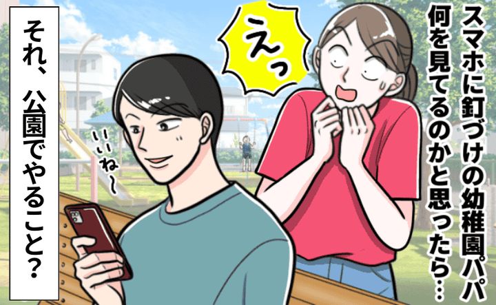 子どもが3歳のとき。幼稚園の振替休日、公園に集まってみんなで遊ぶことになりました。ひとりのパパがわが子を見ることなく、ベンチに座ってずっとスマホに釘づけ。あいさつしようと近づいたところ……。
