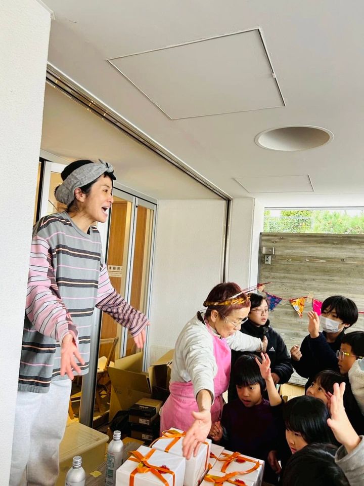 クリスマス&年内最後の開催になるので、【レインボー】ではお昼ごはんは年越し蕎麦、夜ごはんはクリスマスチキンが最近の定番になってきています。お昼ごはんのスタート前から宮内サンタも出勤🎅! 外で宮内サンタを見つけた2歳児のハルキは大喜び。サンタの荷物を引きながら【レインボー】までサンタを案内してくれました♡ 可愛い〜。