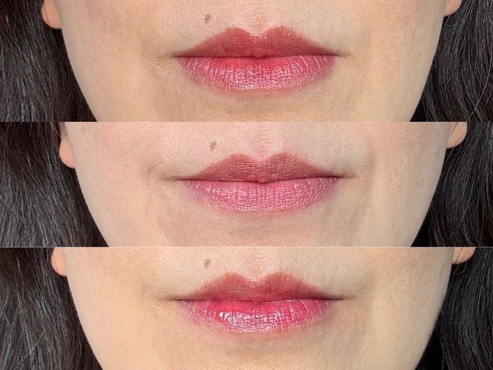 似合う色は人それぞれですが、例として若見えリップを3つ紹介します。リップは直塗りだとしっかり発色し、ブラシ塗りだと直塗りよりも発色がやや抑えられます。また、塗り重ねる回数によっても発色が変わり、さらにティッシュオフする、リップグロスなどを重ね塗りする、コンシーラーを先に塗って自身の唇の赤みを抑えることでも発色を変えることができます。