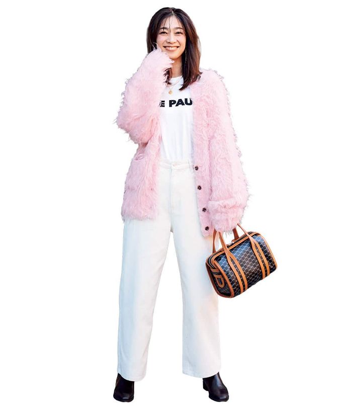カーディガン¥22,000(プランクプロジェクト/プランクプロジェクト 青山店)Tシャツ¥7,150(ザ ポーズ/ウィム ガゼット ルミネ新宿店)パンツ¥19,800(emmi/emmi ニュウマン新宿店)バッグ¥187,000(ピエール アルディ/ピエール アルディ 東京)ブーツ¥28,050ダイアナ/ダイアナ 銀座本店)ピアス¥95,700(Elena Jewelry/ロードス)パールネックレス¥22,000(ジゼルべー/ズットホリック)コインネックレス¥8,800(チビ・ジュエルズ/チビジュエルズ・ジャパン)