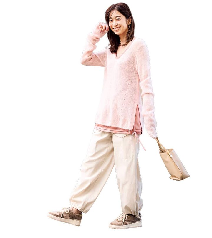 カジュアル服をブラッシュUPする戦略的レイヤード。ピンクの濃淡や異素材をレイヤードして上級コーデに。トップスが甘カラーな分、ボトムスはスポーティなパラシュートパンツで〝スポ可愛〟を意識、ヘルシーに寄せて。