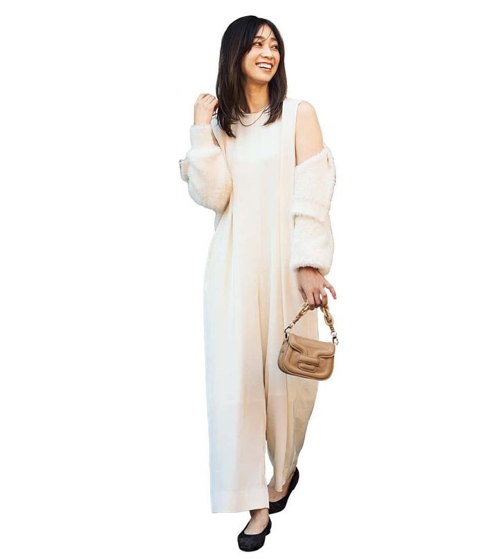 ・自分だけ可愛く映えたい(笑)、同窓会では絶対に白! 清潔感、華やかさ、配色に迷わない、といいことずくめ。ふわもこやサテン、シアーなど、素材感で盛ったりトーンをズラしてメリハリを。(片山あゆみ 46歳 本誌ライター)