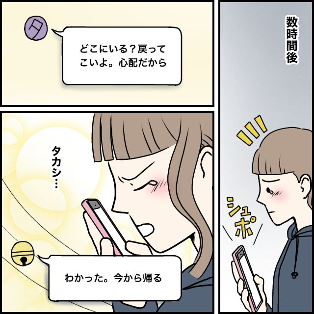 「どこにいる?戻ってこいよ。心配だから」タカシからのメールを見て「タカシ・・」と思わず涙がこみ上げた私は、「わかった。今から帰る」とメッセージを返したのでした。