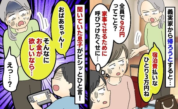 宿泊費1人3万円!?義実家で家事三昧のあと、まさかの金銭要求→すると6歳の息子が!?