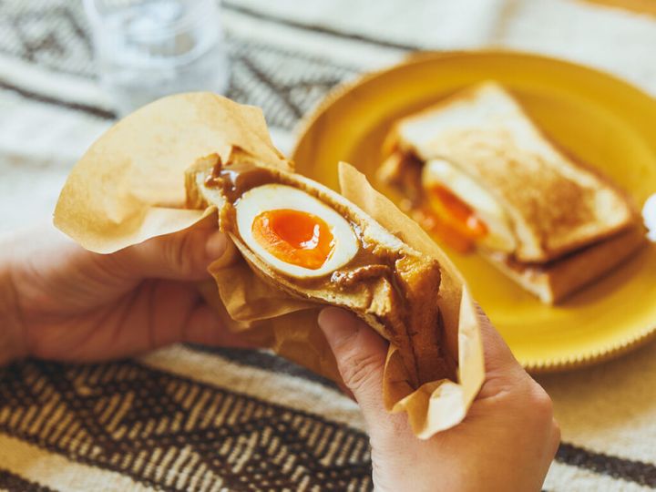 カレーと半熟卵を食パンで包んで焼けば、とろ~りホットサンドに早変わり。手作りでもレトルトでもOK。焼き目の香ばしさと、とろけるようなあつあつのルーで、いつものカレーが別ものに。卵は迷わず半熟が正解です!