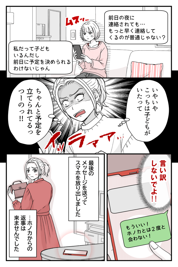 3か月前から会うことを約束していたホノカ。前日になって「明日どうする?」と連絡したところ、なんと「連絡がないから、別の用事を入れてしまった」と言われたのです。
