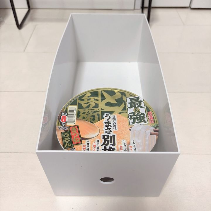 奥行きを活かして、カップ麺を前後に並べてストックするのに最適なサイズです。
