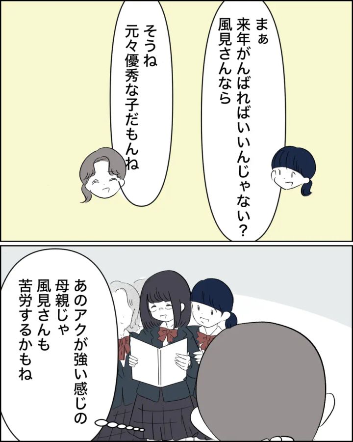「まぁ、来年がんばればいいんじゃない?風見さんなら」とカナちゃんが言うのを聞いた私は、「そうね。もともと優秀な子だもんね」と言いながら、中学のときの話し合いで見た風見さんの母親の態度を思い出して「あのアクが強い感じの母親じゃ風見さんも苦労するかもね」とほんの少しだけ風見さんに同情しました。