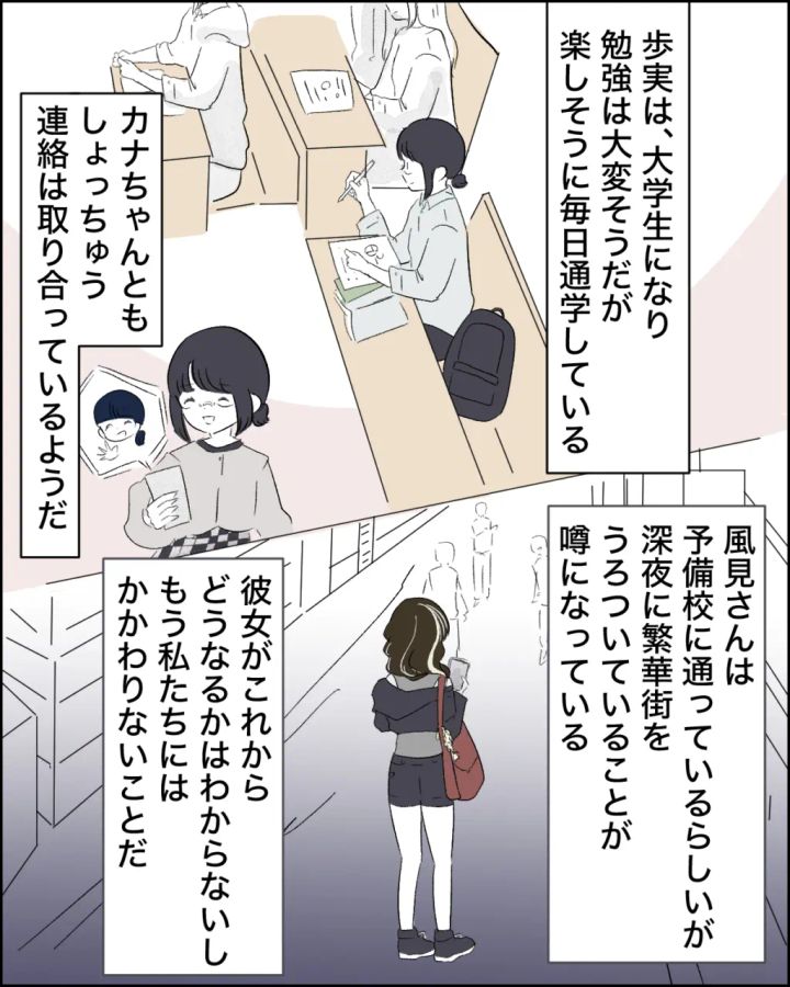 その後、歩実は大学生になり、勉強は大変そうだけれど毎日楽しそうに通学しています。カナちゃんともしょっちゅう連絡は取り合っているようです。風見さんは予備校に通っているらしいのですが、深夜に繁華街をうろついていると噂で聞きました。彼女がこれからどうなるかはわかりませんし、もう私たちにはかかわりのないことです。