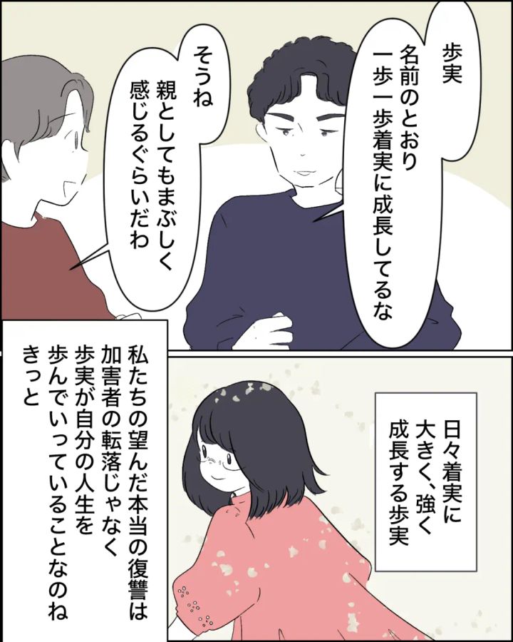 「歩実、名前のとおり一歩一歩着実に成長してるな」「そうね。親としてもまぶしく感じるぐらいだわ」夢に向かって自分の足でしっかりと前に進んでいく歩実の姿を私も博之も心から嬉しく誇りに思います。日々着実に、大きく、強く成長する歩実。私たちの望んだ本当の復讐は、加害者の転落ではなく、歩実が自分の人生を歩んでいっていることなのだとしみじみと感じています。