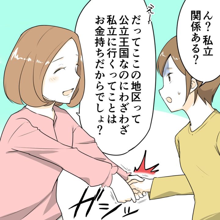 「ん?私立?関係ある?」たしかにナミは私立の中学校に通っていますが、それとこれと何の関係があるのでしょうか。頭の中がハテナでいっぱいの私に「え~。だって、ここの地区って公立王国なのにわざわざ私立に行くってことは、お金持ちだからでしょ?」と笑顔で私の手をガシッと握ってくるハルちゃんママ。え?何?怖いんだけど・・。