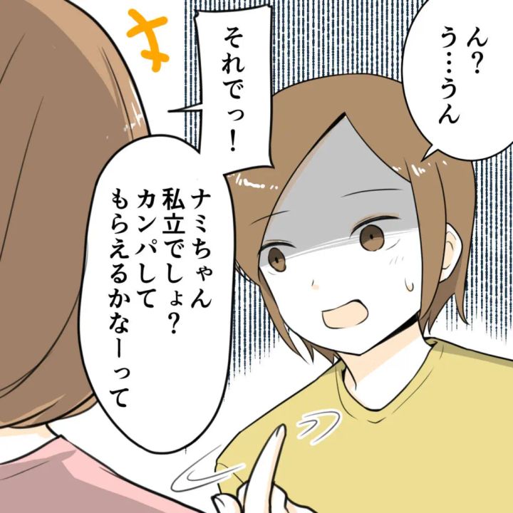一瞬納得してしまいそうになりましたが・・いやいや、やっぱりおかしくない?「ん?う・・うん」と曖昧な返ししかできないでいると、ハルちゃんママは「それでっ!」と一方的に話を進めました。「ナミちゃん私立でしょ?カンパしてもらえるかなーって」と言われ、話についていけない私。