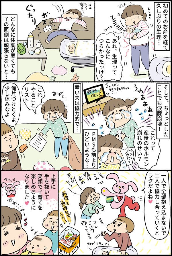 ・産後初の生理は今まで味わったことのないほど重く、つらかったです。体調不良の中、小さな子どもの面倒をみるのは本当に大変で、掃除も料理も洗濯も何もできなかったのですが、生きることはできたので、こんな感じでもいいのかと手の抜き方がわかるようになりました。(M.H)