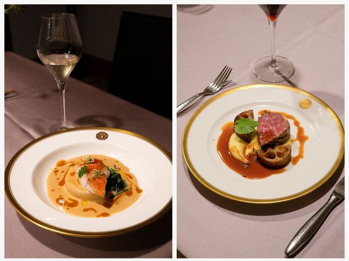 魚料理:金目鯛のポワレ 高原ほうれんそうのエチュベ ソースヴェルモット 甲殻類のジュ/肉料理:那須野ヶ原牛サーロインのロティ 那須のむらさき香るソースジャポネ