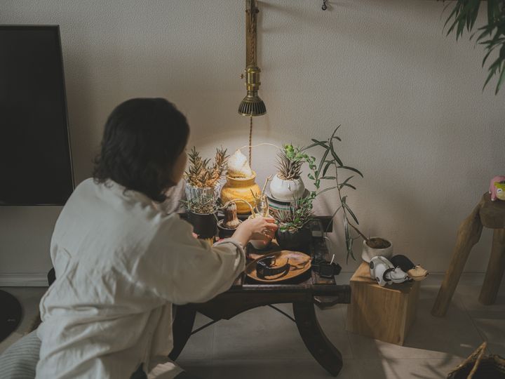 植物を点在させて緑を楽しんだり、気分に合わせて小物を入れ替えたりと、こまめなレイアウト変更も楽しんでいるというkajikoさん。
