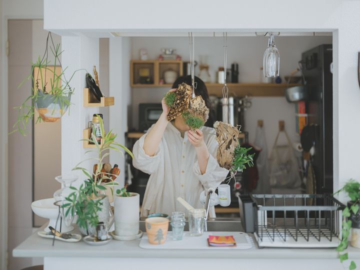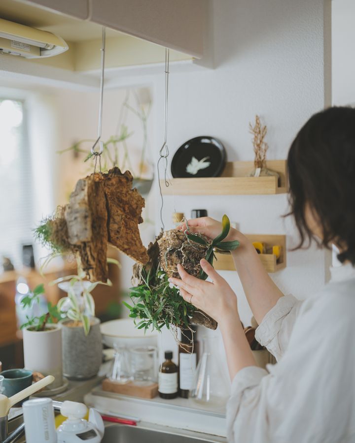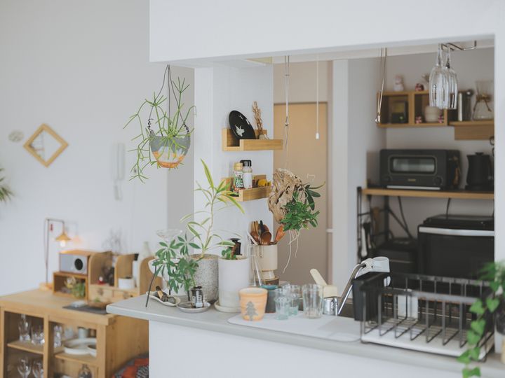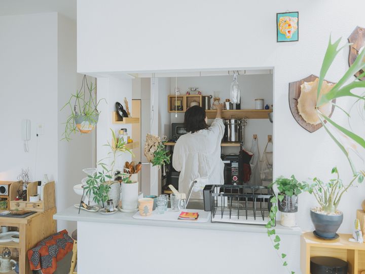 また、キッチンスペースは植物の水やりも兼ねています。植物たちは個性的な鉢に植えられており、毎日の水やりを楽しみながらキッチンに彩りを添えています。