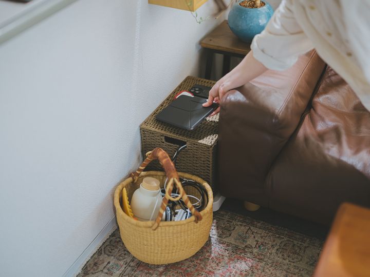 小さなアイテムやコード類もかごにまとめ、見た目もスッキリ。