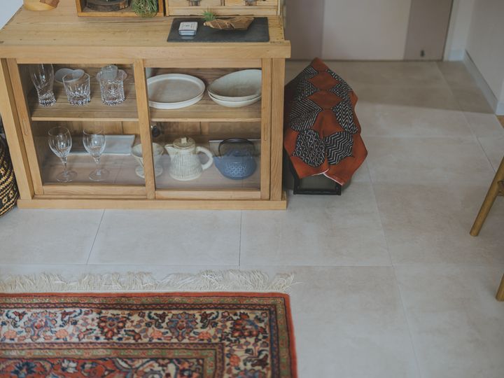 「食器棚を置くようになってから、床がどうしても合わないと感じるようになり、床も全体的にフロアタイルを敷いてお部屋の印象を大きく変えました」