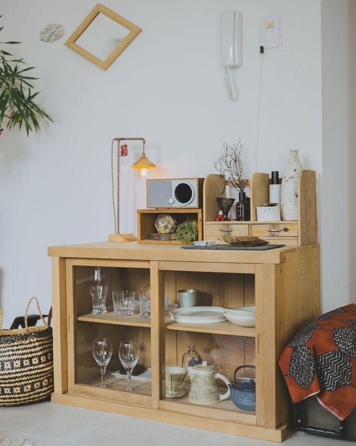 「以前からペジテの食器棚が欲しかったんです。実物を見ずに寸法だけを頼りに決めましたが、飾り棚兼食器棚としてお気に入りの食器を見せて収納でき、視界に入ってもノイズにならないデザインが気に入りました」