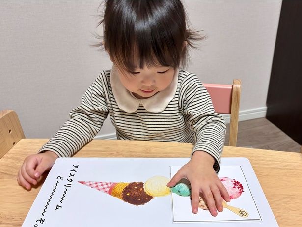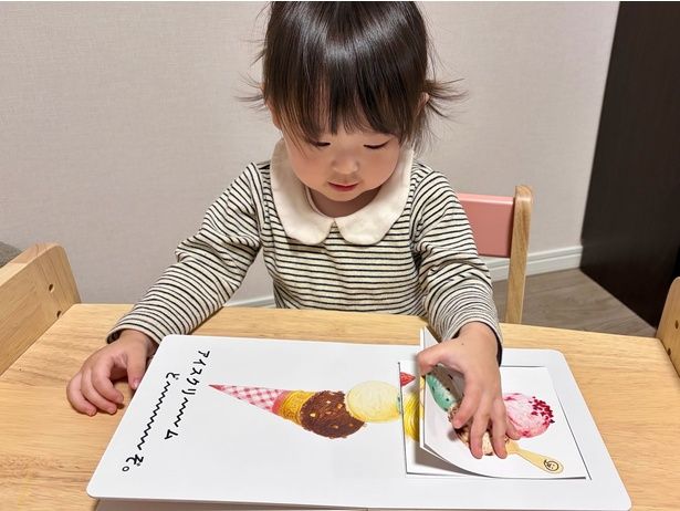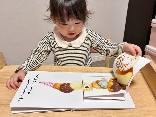 さっそく開いたページには、美味しそうなアイスクリームの絵が! 親が「アイスクリーム、どーーーぞ!」と声をかけると、娘も「どーーーぞ!」とマネしながら、アイスクリームに手を伸ばします。